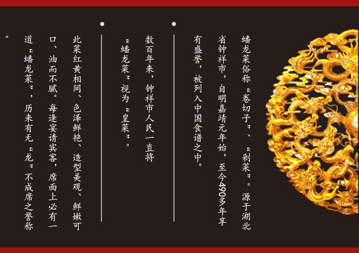 嚴選優(yōu)質(zhì)原料,歷史名菜,傳遞正宗鐘祥蟠龍菜!